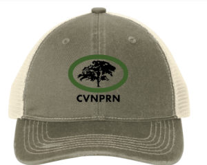 Champlain Valley Native Plant Restoration Nursery Hat: Keep the sun out of your eyes while planting all of your wonderful new plants with our CVNPRN Logo hats! 100% cotton twill front panel with soft polyester mesh mid and back panels distressed edging at the bill and top of crown. Unstructured with a Low-profile and 7-position adjustable snapback closure. The bill and crown are a light olive color paired with a stone mesh. These comfortable and stylish hats have our nursery logo embroidered on the front.