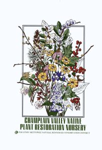 Champlain Valley Native Plant Restoration Nursery T-Shirt: Promote the beauty of native plants with a Champlain Valley Native Plant Restoration Nursery t-shirt.  Shirt design features a bouquet of a variety of native flowers, trees, and shrubs.  White, tri-blend, unisex style shirt. Please indicate preferred size. S, M, L, XL